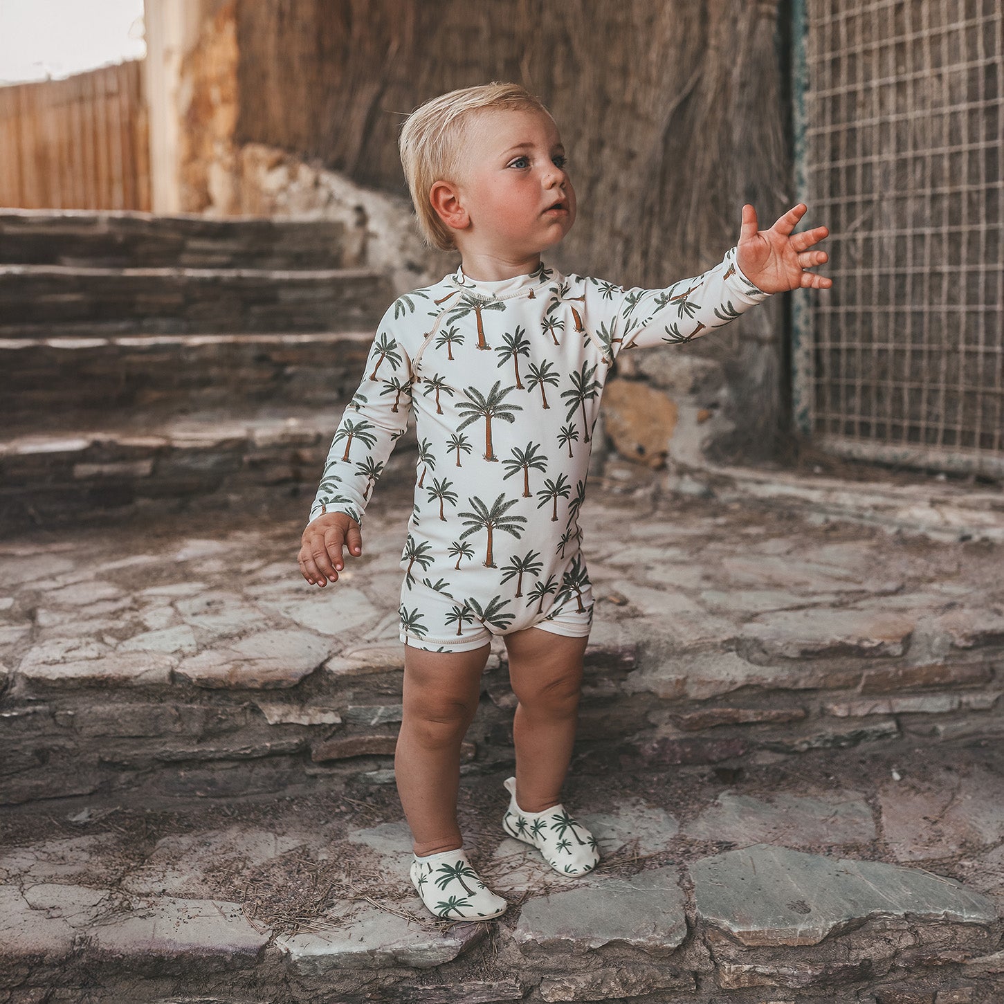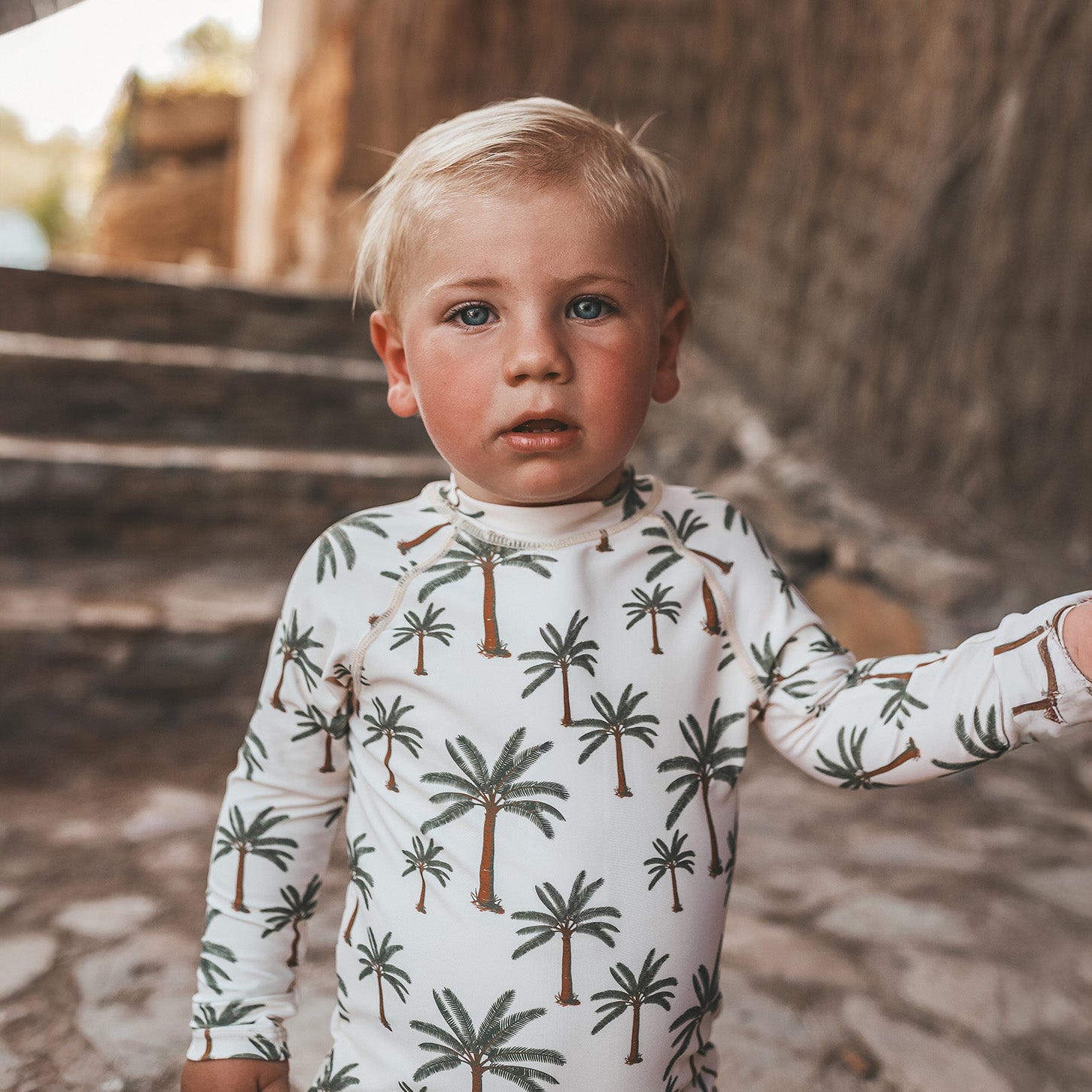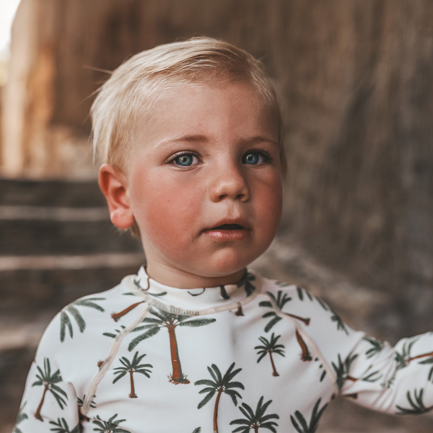 Laat de palmbomen de gids zijn naar eindeloze zomerdromen. De Crown Tree Longsleeve Swimsuit is een goede keuze voor wateravonturen op zonnige dagen. De Longsleeve Swimsuit biedt niet alleen bescherming tegen de zon, maar is ook ontworpen voor comfort en beweging. Gemaakt van een zachte en rekbare mix van 82% polyester en 18% elastaan, biedt het ook nog eens UPF50+ bescherming, zodat degevoelige huid van je kindje goed beschermd blijft tegen schadelijke zonnestralen. Met de handgetekende Crown Tree-print in een mooie beige tint, past deze longsleeve perfect bij de Bucket Hat. De ritssluiting met ritsgarage zorgen voor extra comfort. Bescherm je kindje in stijl met Salted Stories, het merk dat zon, ze een avontuur perfect combineert!