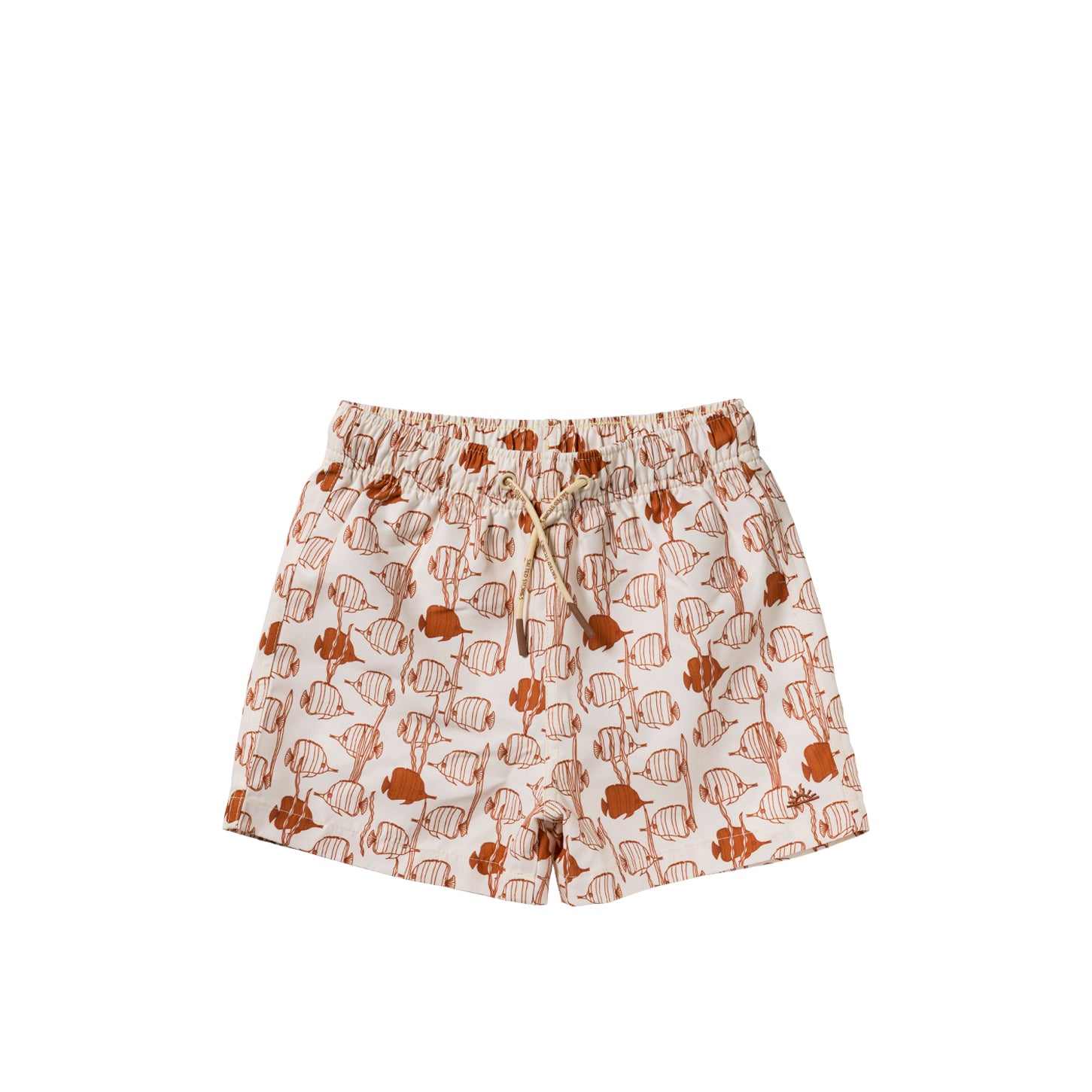 Op zoek naar een jongens zwembroek met vissenprint in warme aardetinten? Dit is een zomerse must-have voor iedere mini beach lover.