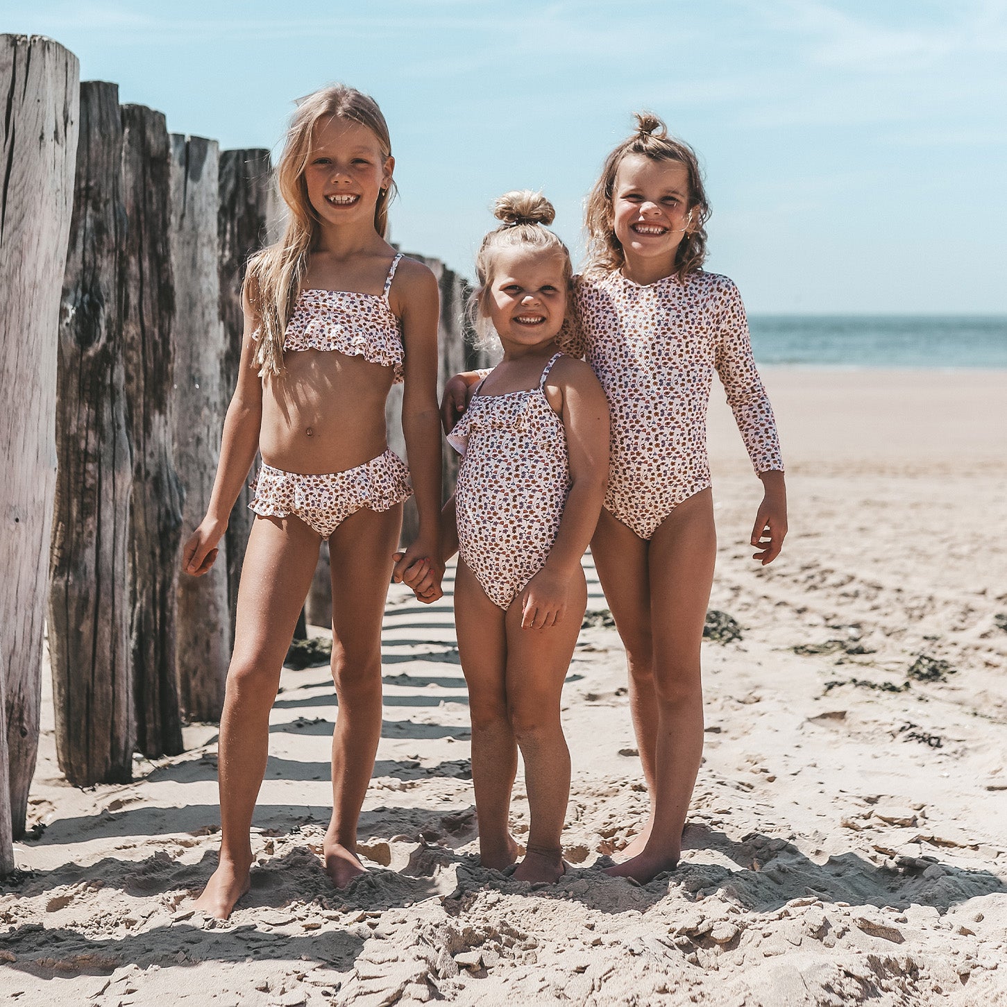 Het badmode-setje is gemaakt van een hoogwaardige knit swimwear-stof (82% polyester, 18% elastaan) en heeft een comfortabele voering in de kleur Shortbread. De stof is ademend en ideaal voor zonnebaden of spelen in het water. De UPF50+ bescherming blokkeert maar liefst 98% van de schadelijke Uv-stralen, zodat jouw meisje veilig kan genieten van de zon.