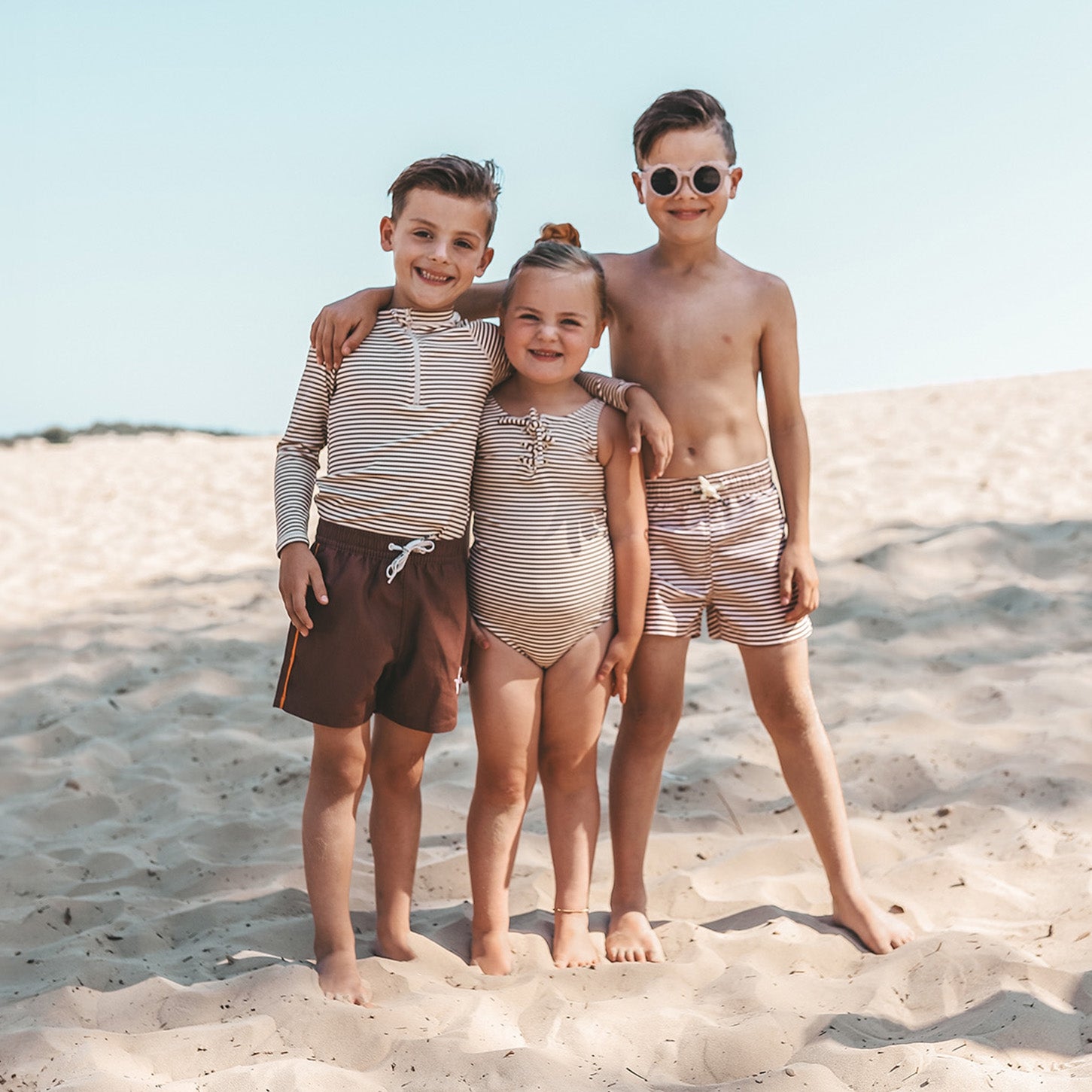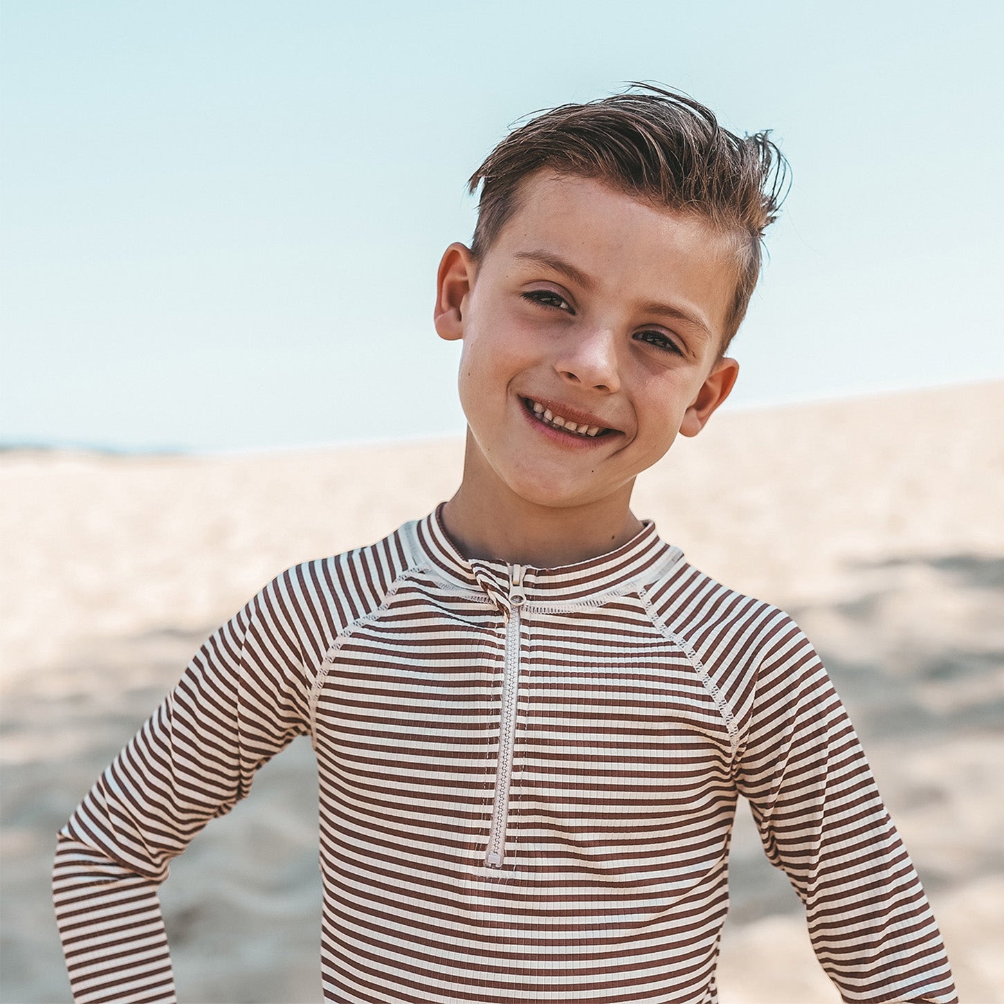 Mit dem Stijn-Schwimmshirt ist Ihr Kleines gut vor der Sonne geschützt und immer im Vorteil! Das Badeshirt ist in den Größen 62/68 bis 134/140 erhältlich und lässt sich dank des Reißverschlusses auf der Brust ganz einfach über dem Kopf an- und ausziehen. Der Reißverschluss besteht aus Kunststoff, damit er durch die Sonne nicht heiß auf der Haut wird, und ist mit einem Kinnschutz versehen. Das Stijn-Bade-T-Shirt besteht aus schnell trocknendem Frottee mit UPF50+-Schutz, der Ihr Kind besser vor Sonnenbrand schützt. Kombinieren Sie das Stijn-Bade-T-Shirt mit der Scott-Badehose oder der Stef-Badehose und schon kann der Wasserspaß beginnen!
