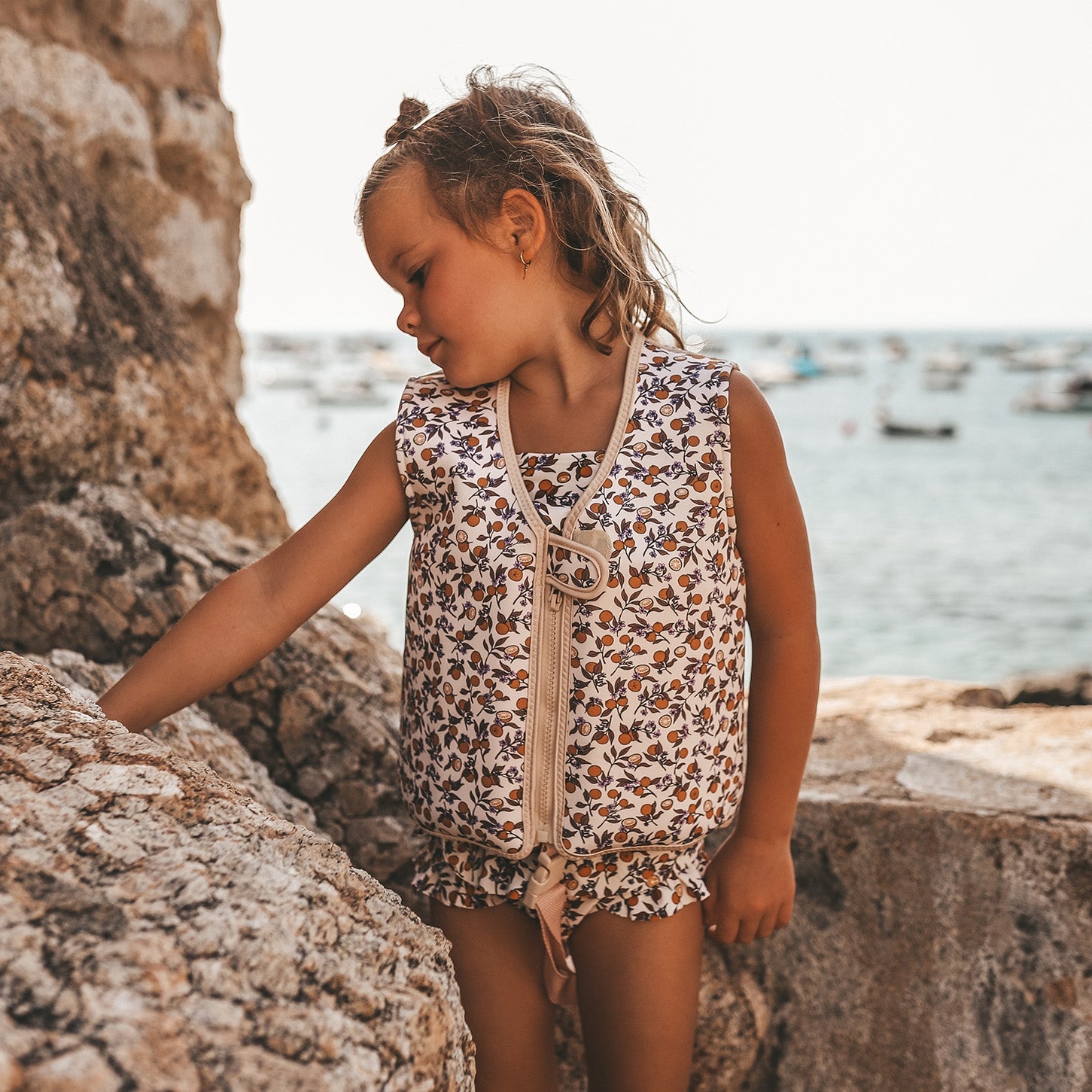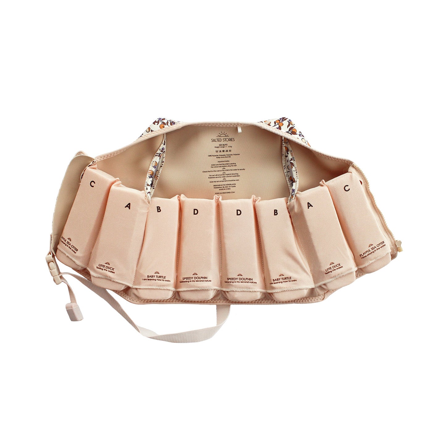 Let your child play more carefree in the water with the Floating vest, available from size 86/92 to 110/116. The unisex life jacket is soft to the touch and has a zipper with extra Velcro over it that provides an extra secure closure, but also protects the chin from bumping against the zipper. The Floating Vest also has an additional buckle that you fasten through the legs, so your little one can never slip out of the vest. With the floating vest, your child can become increasingly confident in the water and thus improve their swimming skills, allowing the floating elements on the inside of the vest to be gradually removed. The better your child is in the water, the more elements can be removed. Here you start by removing the A elements until gradually removing the D elements, if necessary. The playful print of the Floating Vest combines perfectly with the Shawn swimsuit or the Safi bodysuit and makes splashing in the water even more fun!