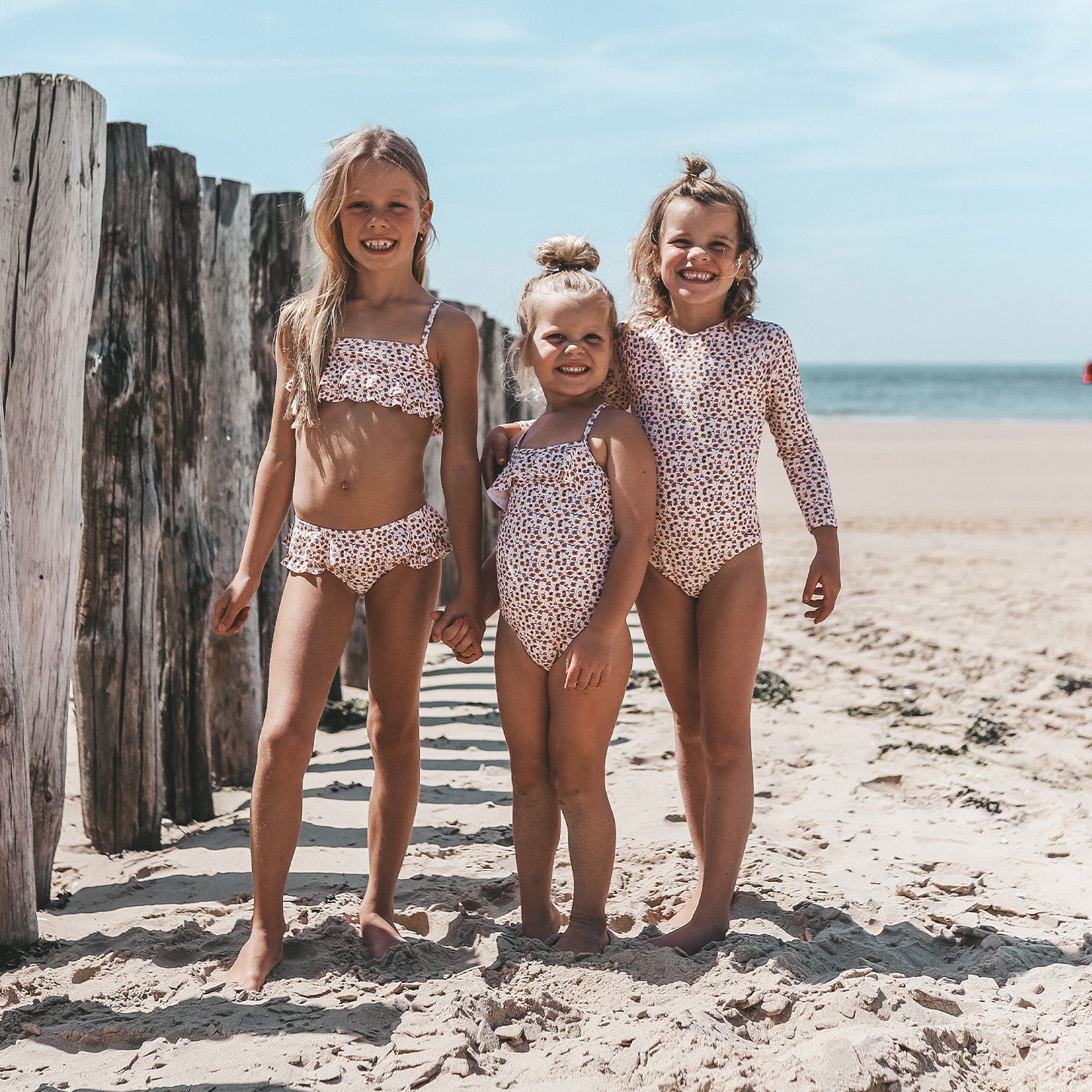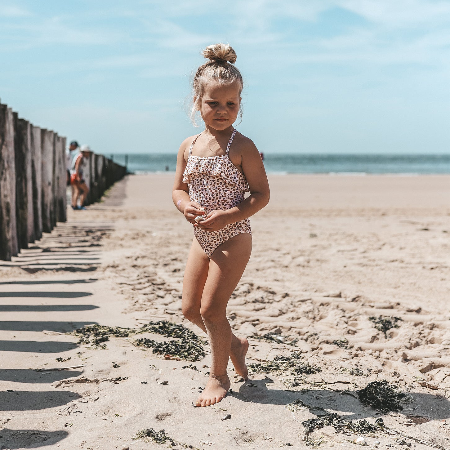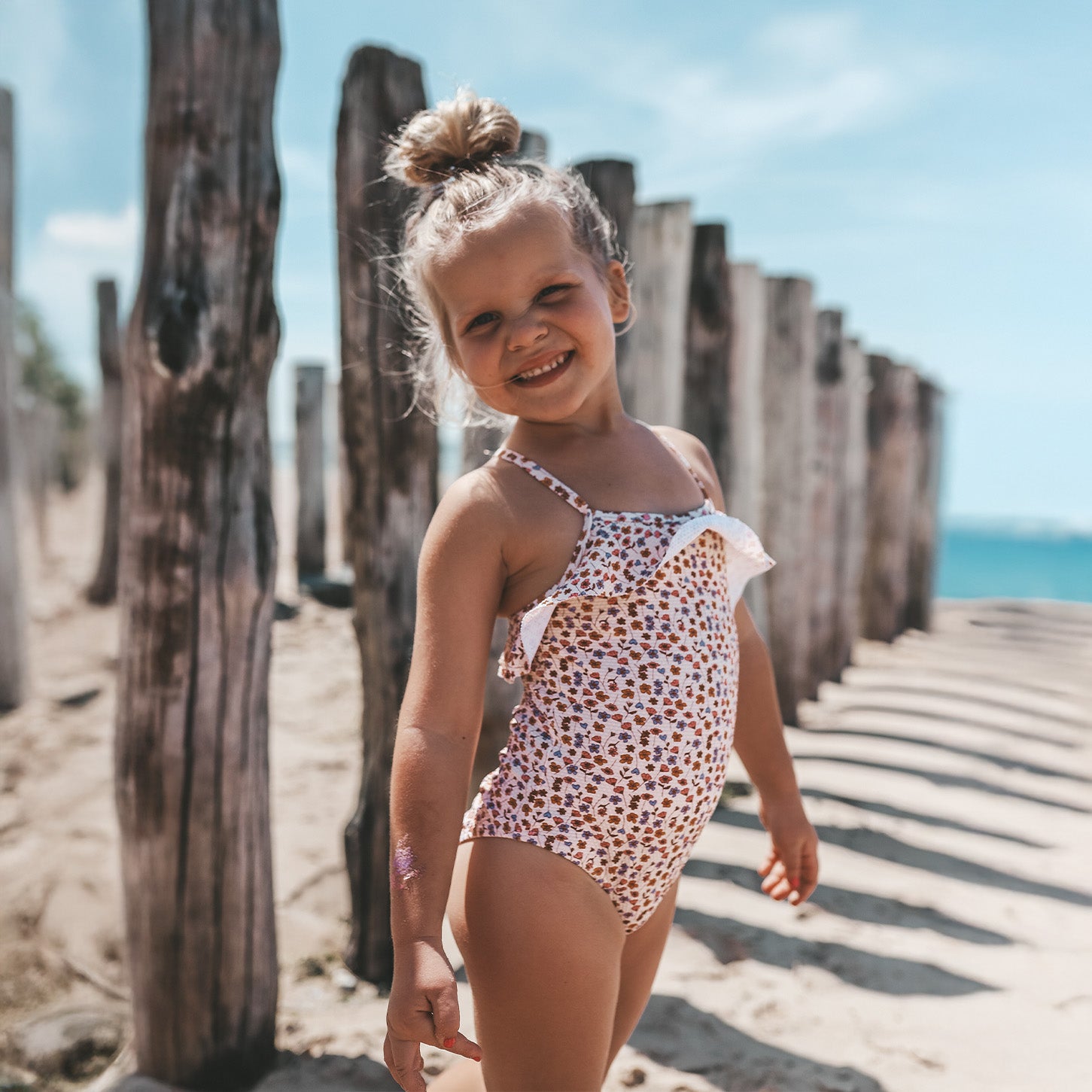 Flowers everywhere – Het Flower Bud Swimsuit is de perfecte combinatie van stijl, comfort en bescherming voor zonnige dagen! Met schattige ruffles aan de bovenkant en bij de heupen krijgt dit badpak een speelse, girly touch. De unieke, handgetekende Flower Bud-print en de verfijnde pasvorm maken dit een echte zomerse eyecatcher. De verstelbare bandjes met een gouden randje zorgen voor de perfecte fit voor jouw meisje.