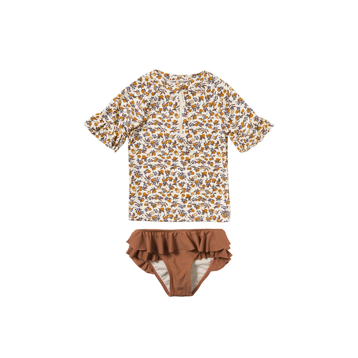 An orange a day keeps the doctor away with the Sabrina swim tee set, available from size 62/68 to 134/140. The set consists of a swim tee and loose pants, but both feel soft, are lined, dry quickly and have UPF50+ protection. This means that the fabric blocks up to 98% of UV radiation and therefore better protects your child from the sun! The swim tee of the Sabrina swim tee set has a plastic zipper with chin protector that will not heat up on the skin due to the sun. Combine the Sabrina swim tee set with matching swimming armbands such as the L'orange Swimming Bracelets or the Savi swimming shoes and complete the look!