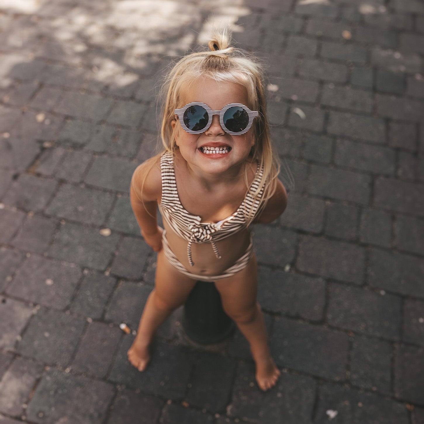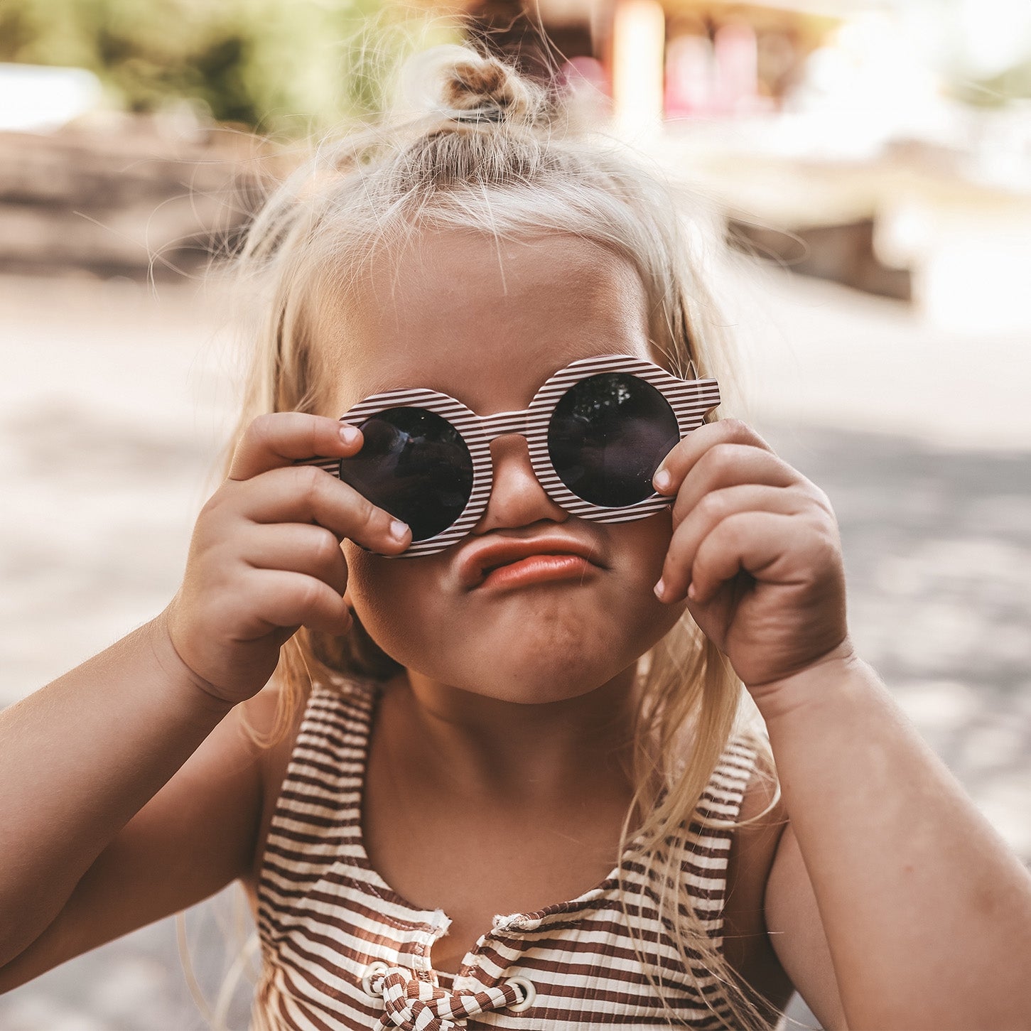 With the Saron sunglasses your child always has an advantage on sunny days! The sunglasses come with a box with a cleaning cloth, so you can store them safely. The glasses have a round frame with white and brown stripes that match perfectly with the Skip bodysuit or the Saskia bodysuit. In addition, the Saron glasses have UV-400 protection and are suitable for children of all ages from approximately 2 years old.