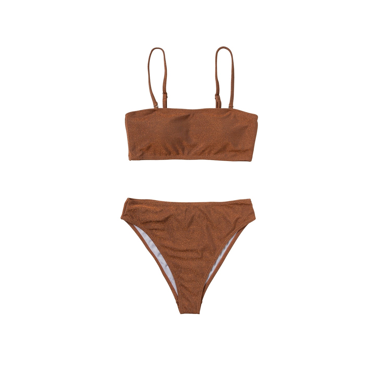 It's your time to shine with the Sharon glitter bikini, available from size S to XL. Both the top and the bottoms are fully lined and the top has two removable cups. The shoulder straps of the Sharon bikini are adjustable, but can also be removed. This would also give you the option to wear the bikini strapless! The great thing about the Sharon glitter bikini is that it does not itch when wearing and dries quickly, but the fabric also has UPF50+ protection. This means that the fabric blocks up to 98% of UV rays and helps protect you from sunburn. Ideal, right? Combine the Sharon glitter bikini with the Sami glitter bikini or Sanna glitter swimsuit and create the perfect match with your mini-me!