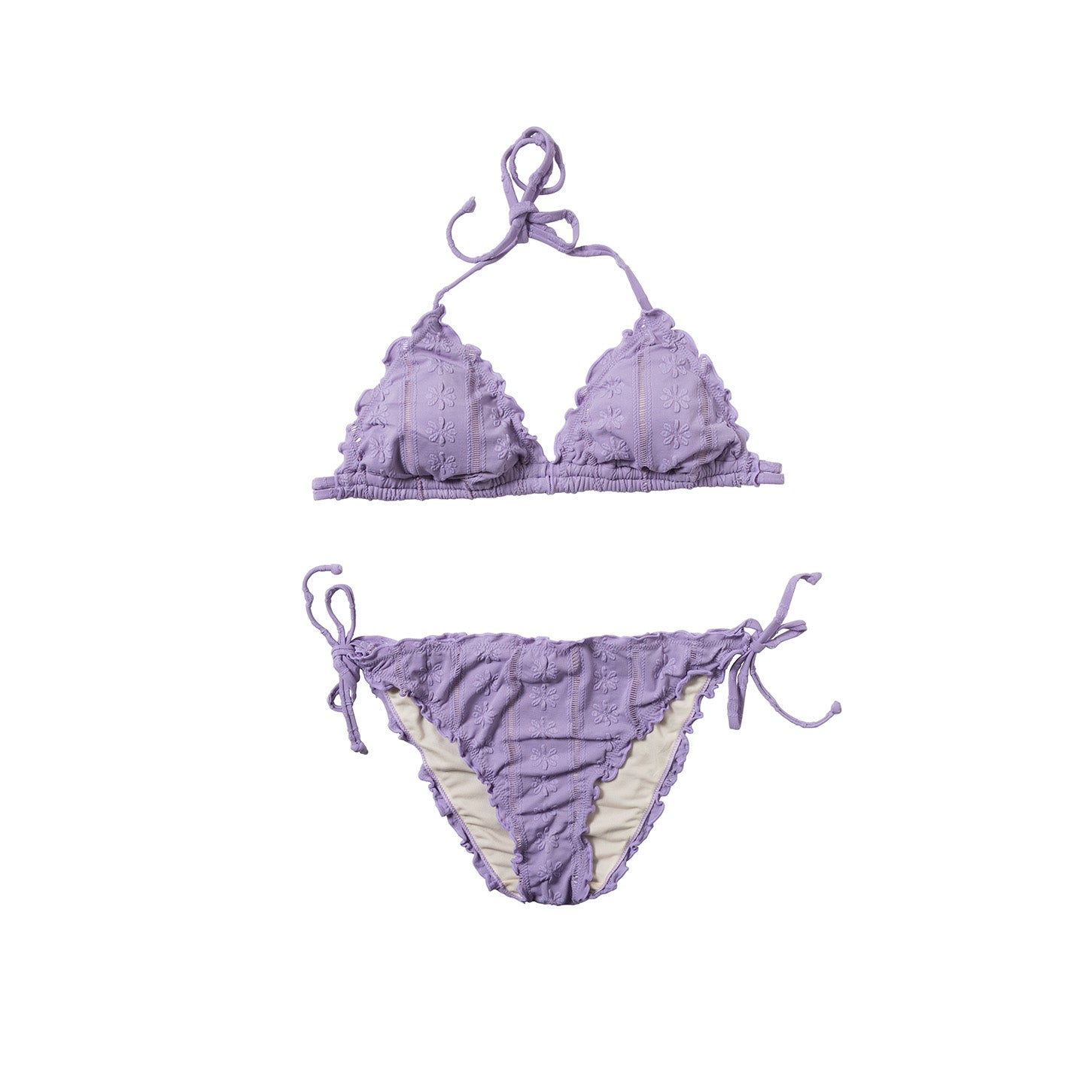 Every season is bikini season with the Stacey bikini set, available from size S to XL. The bikini is made of standard terry cloth, dries quickly and both the bikini top and bottoms are fully lined. The bikini set also has UPF50+ protection, which means that the fabric blocks up to 98% of UV rays. This means your skin is better protected against sunburn. The Stacey bikini set also brings out the fashionista in every mother thanks to the ruffle details, 3D flowers and lilac color. The bikini set also has removable cups and you can tailor the top and bottom yourself perfectly to create the ideal fit. What else do you want? The Stacey bikini set suits not only mothers, but also daughters! We have extended the lilac version with 3D flowers into the Sofia swimsuit and Suus bikini set so that you can match it with your mini-me!