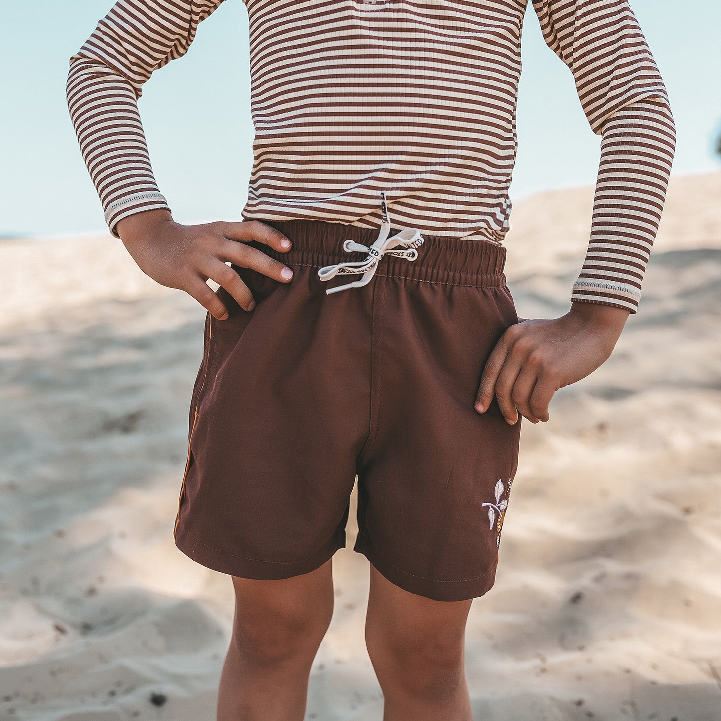 Squeeze the day with the Stef swim trunks, available from size 62/68 to 134/140. The swim trunks are made of quick-drying terry cloth and have an elastic waistband with an extra drawstring for the ideal fit. The Stef swimming trunks are finished with two side pockets, a bright orange stripe and an embroidered detail at the bottom of the right leg. The swim trunks also have a mesh inner brief and UPF50+ protection, which gives your child better protection against sunburn. Combine the Stef swim trunks with the Sidney sun hat and your little one is ready for fun in the sun!