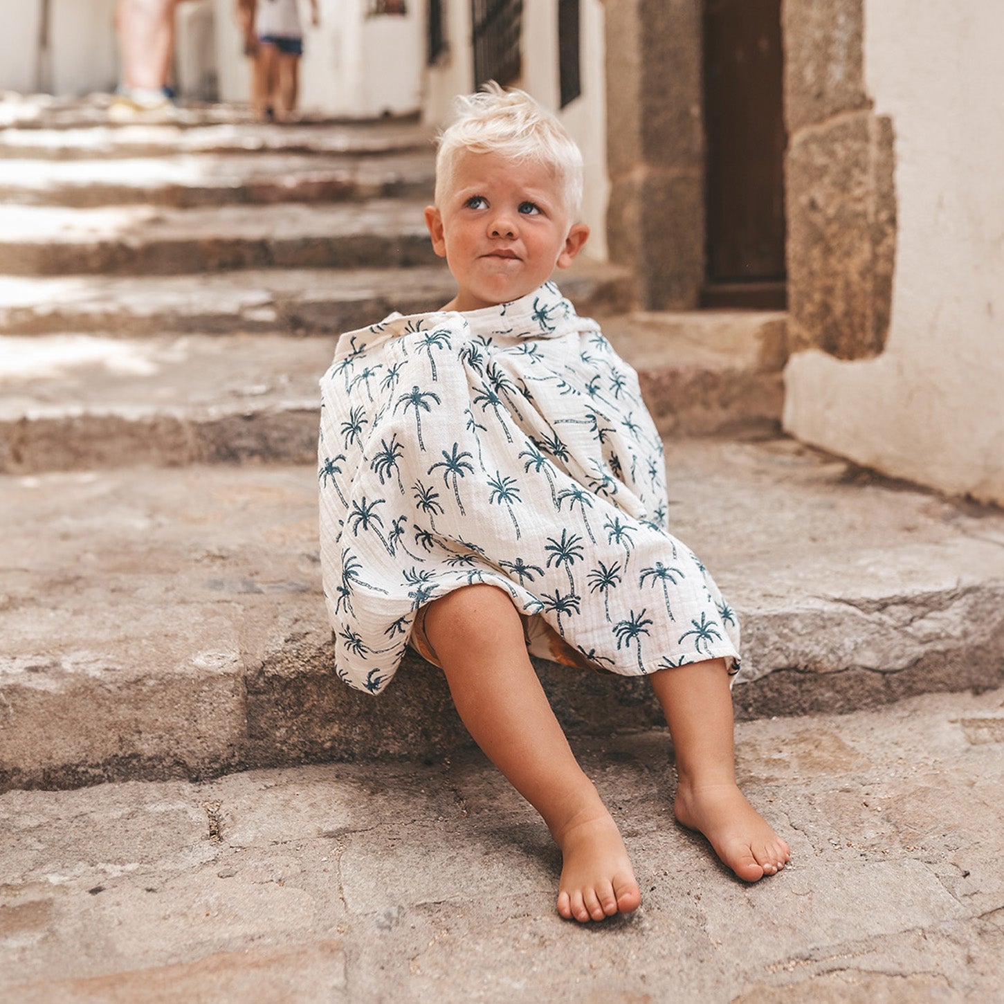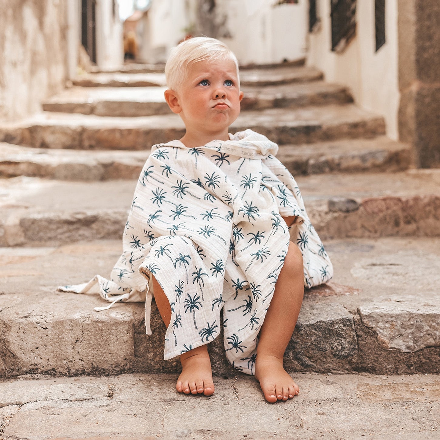 The Steve poncho is perfect for a day at the beach, after a bath or after swimming lessons and is available from size 62/68 to 134/140. The poncho has a unique, self-drawn palm tree print that really brings out that summer feeling. This print has also been incorporated into the Sjoerd rug. In addition, the Steve poncho is made of 100% cotton, feels soft and dries quickly. Furthermore, the poncho has a hood and there are two pieces of fabric on both sides that you can tie together to ensure that the poncho stays in place. Have you already added the cool Steve poncho to your shopping cart?