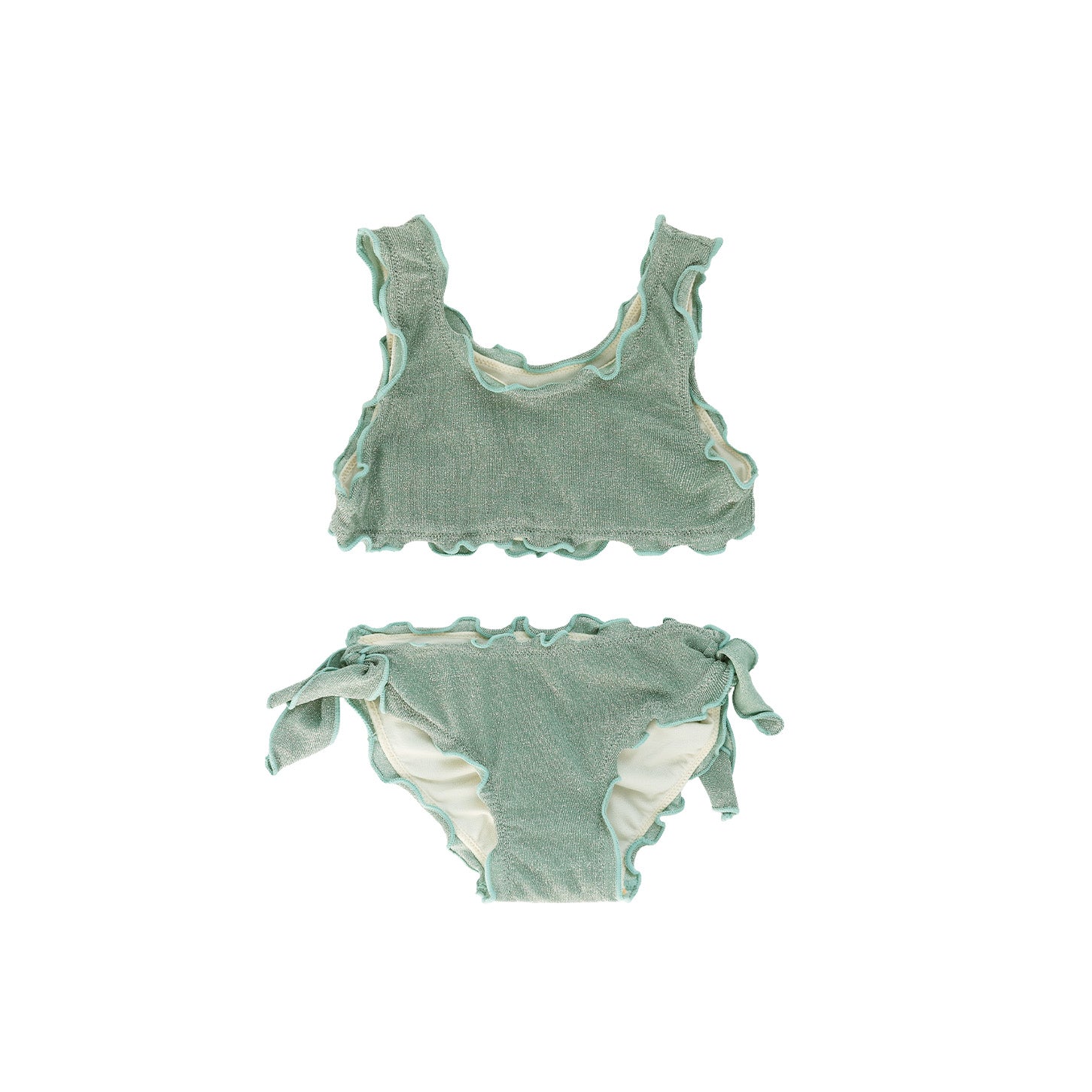 Deze Glitter Bikini is de perfecte keuze voor meisjes die willen schitteren op zonnige dagen. Gemaakt van een luxe knit swimwear-stof met een subtiele glitter, zorgt deze bikini voor een sprankelende look. De prachtige kleur Green Bay geeft een frisse, zomerse uitstraling, terwijl de ruffles een schattig en meisjesachtig accent toevoegen.