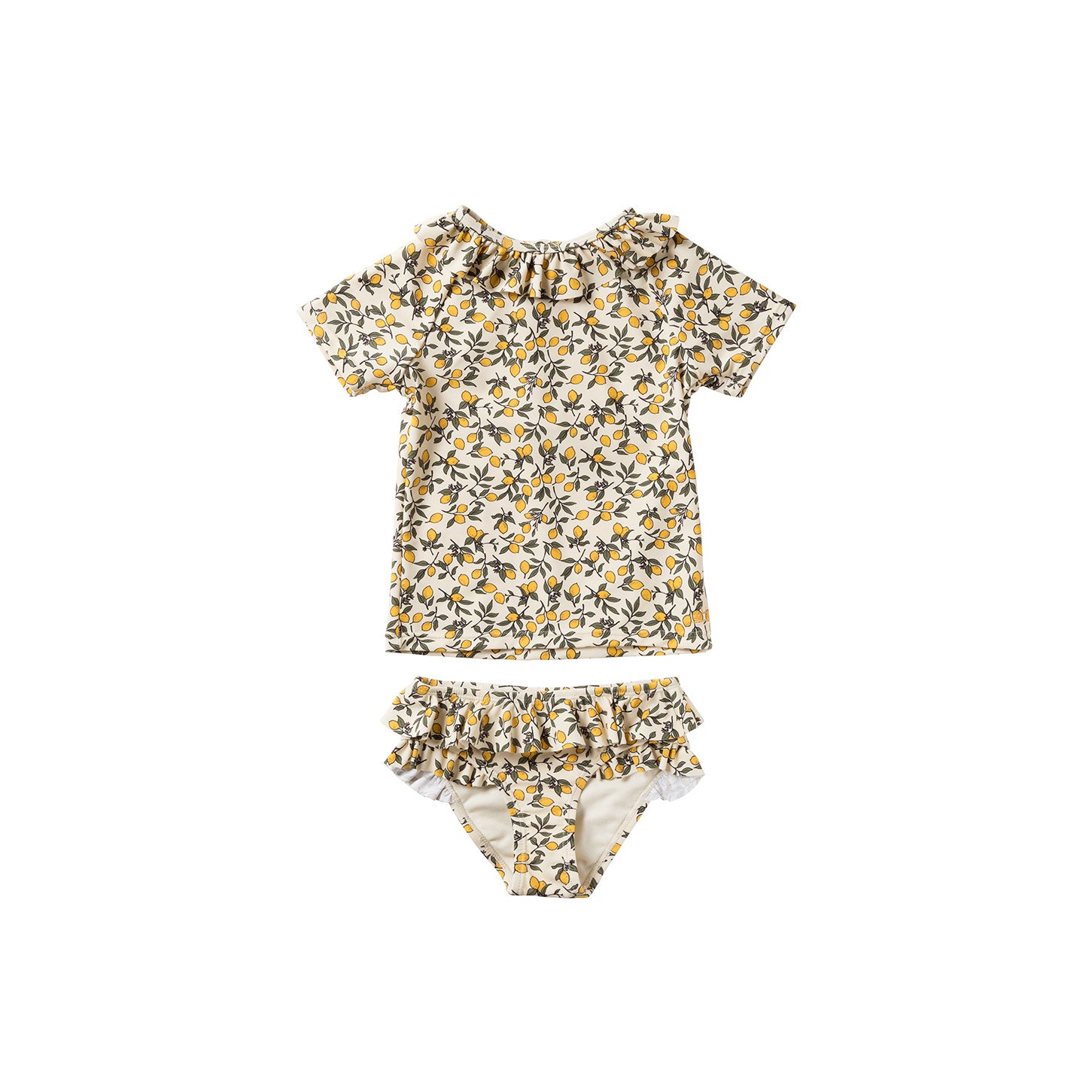 Het setje heeft een plastic zipper in de kleur wit, die ook nog eens de huid van je kindje beschermt. De taille en pasvorm zorgen ervoor dat je kleintje comfortabel speelt, of het nu op het strand is of in het zwembad. Het design is afgewerkt met schattige ruffles en korte mouwen, waardoor het extra vrolijk oogt. De Lemons Set is perfect te combineren met de Lemons zwemschoentjes en een swimring, zodat je kindje helemaal klaar is voor een vakantie in de zon!
