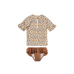 An orange a day keeps the doctor away met de Sabrina swim tee set, verkrijgbaar vanaf maat 62/68 tot 134/140. De set bestaat uit een swim tee en een los broekje, maar beide voelen zacht aan, zijn gevoerd, drogen snel en hebben een UPF50+ bescherming. Dit betekent dat de stof tot 98% van de uv-straling blokkeert en jouw kindje dus beter beschermt tegen de zon! De swim tee van de Sabrina swim tee set heeft een plastic rits met kin-beschermer welke niet warm zal worden op de huid door de zon. Combineer de Sabrina swim tee set met bijpassende zwembandjes zoals de L’orange Swimming Armbands of de Savi zwemschoentjes en maak de look compleet!