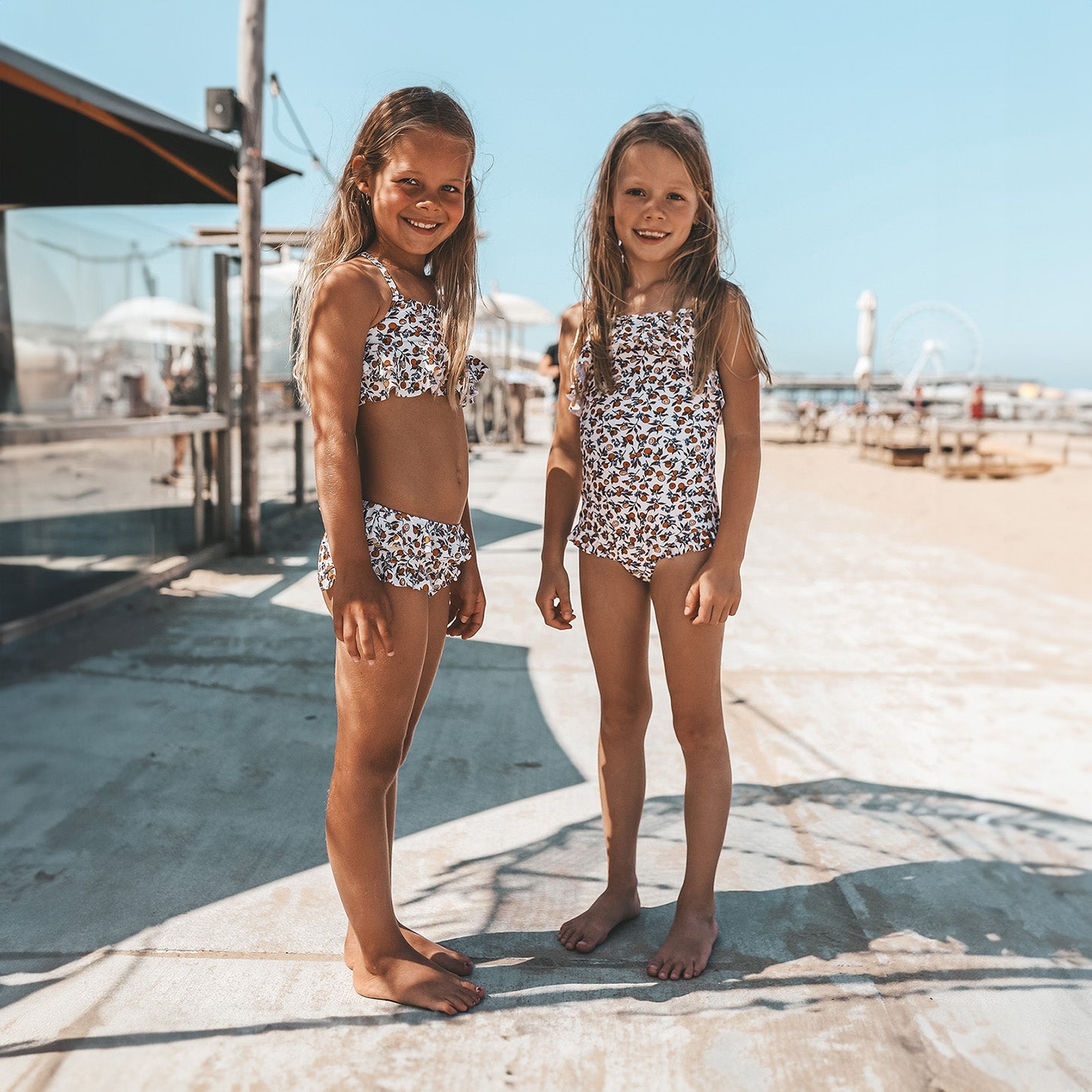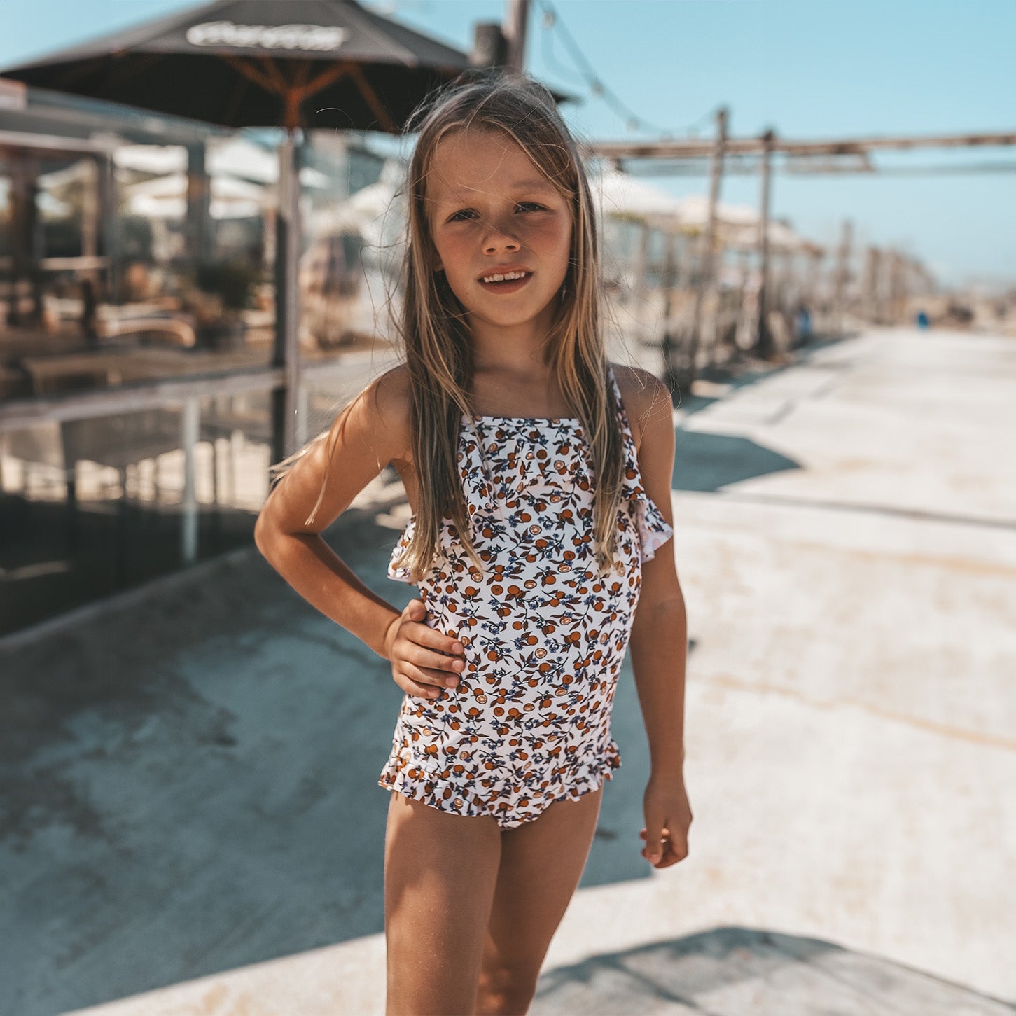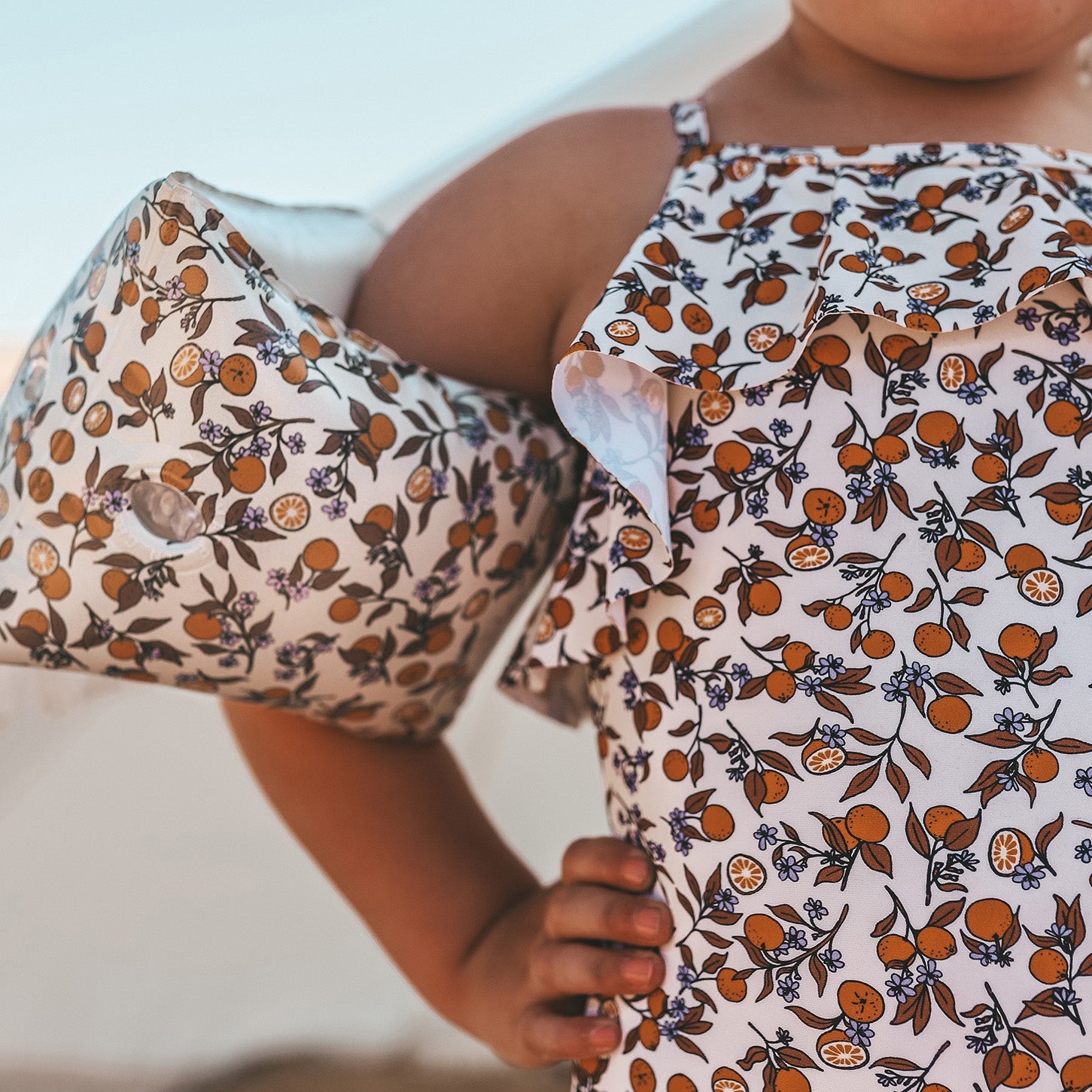 An orange a day keeps the doctor away met het Saar badpak, verkrijgbaar vanaf maat 62/68 tot 134/140. Het badpak is volledig gevoerd, voelt zacht aan en droogt snel wanneer je kindje uit het water komt. Daarnaast heeft het Saar badpak een UPF50+ bescherming, wat wil zeggen dat de stof tot 98% van de uv-straling tegenhoudt en jouw kindje dus beter beschermt tegen verbranden in de zon. Het Saar badpak heeft gekruiste schouderbandjes die versteld kunnen worden met een goudkleurige gesp voor de ideale pasvorm. Het pakje valt natuurlijk het meest op door de sinaasappeltjes print met subtiele bloemetjes ertussen en de ruffles op de borst en net onder de heupen. Maak de look van het Saar badpak helemaal compleet met de bijpassende L’orange Swimming Armbands.