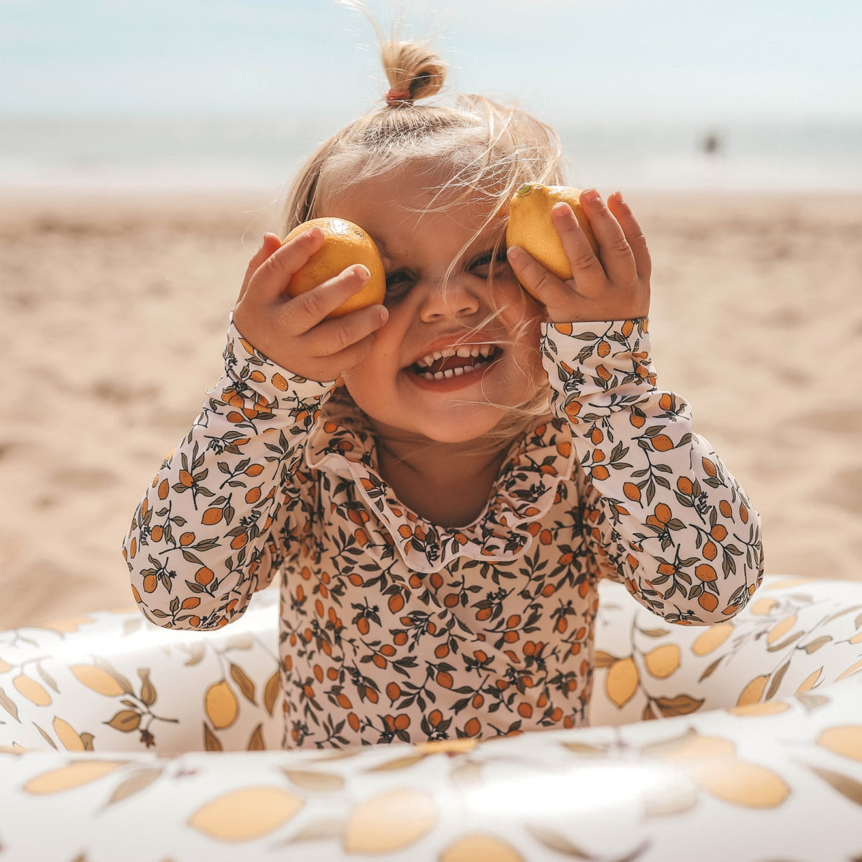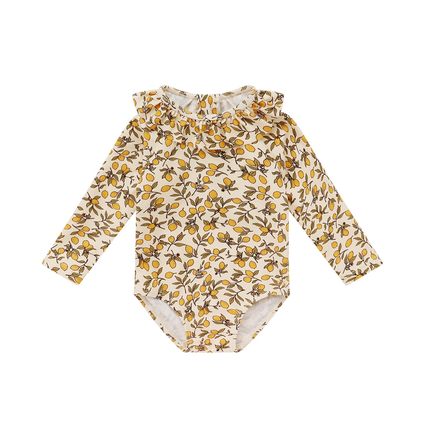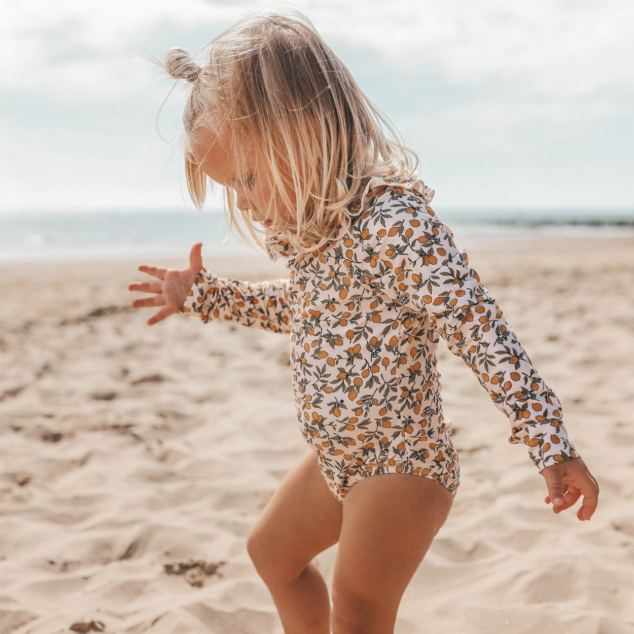 Deze bodysuit is een schattig en functioneel zwempakje voor je kindje. De bodysuit is alleen gevoerd bij het kruis en heeft een leuk ruffle detail. Met de rits van plastic wordt oncomfortabel metaal vermeden en het beschermlaagje van stof over het einde van de rits biedt draagcomfort. Gemaakt van hoogwaardige UPF 50+ stof, biedt deze bodysuit de perfecte bescherming tegen de zon voor je kleintje tijdens het zwemmen.