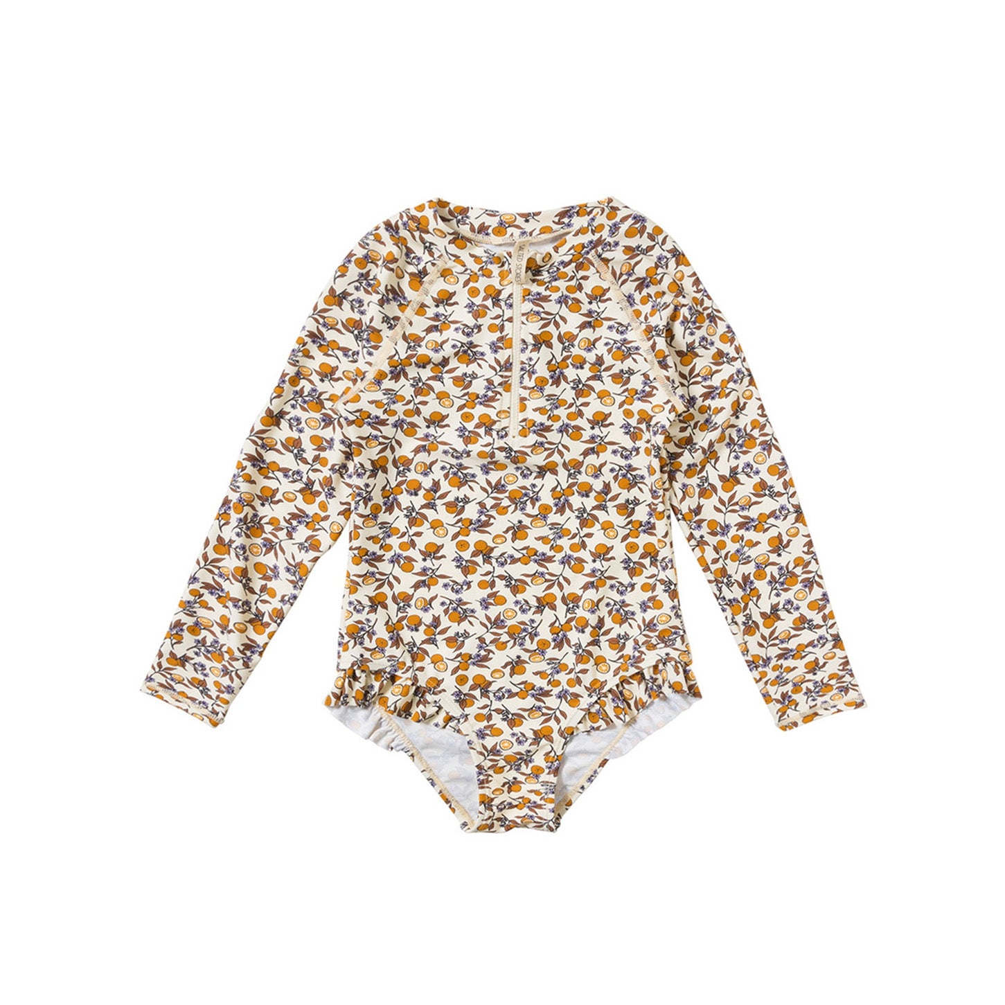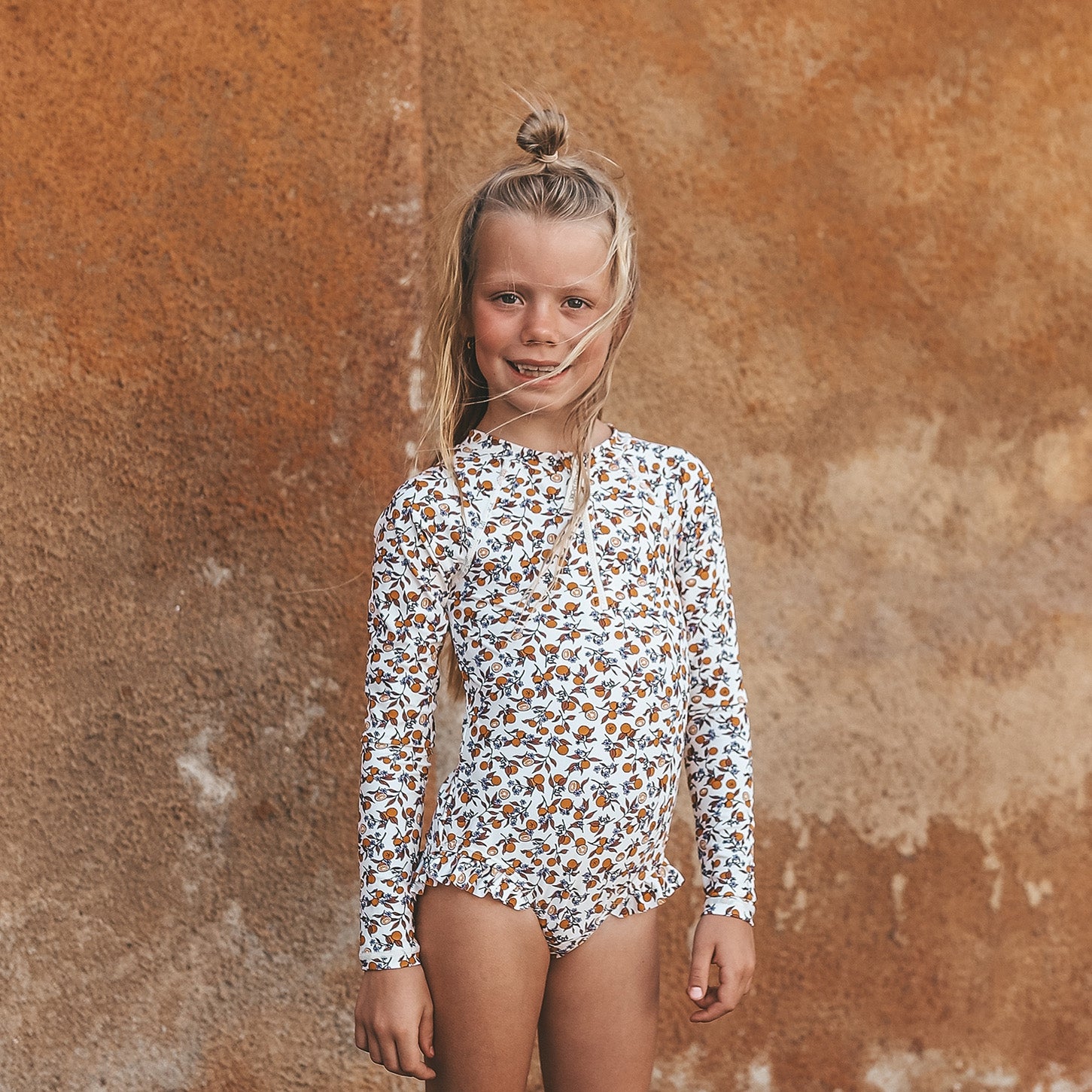 An orange a day keeps the doctor away met de Safi bodysuit, verkrijgbaar vanaf maat 62/68 tot 134/140. De bodysuit is bij het kruis gevoerd, voelt zacht aan, droogt snel en is voorzien van drukknopen bij het kruis. Dit is zowel makkelijk bij het verschonen van de luier als wanneer je kindje al zelf naar de toilet kan, aangezien de bodysuit niet helemaal uit hoeft. Deze drukknopen zijn verwerkt in het kruis tot en met maat 86/92, vanaf 98/104 niet meer. Ook heeft de Safi bodysuit een UPF50+ bescherming, wat betekent dat jouw kindje beter beschermd is tegen verbranden door de zon. De bodysuit heeft verder een plastic rits met kin-beschermer die niet warm wordt op de huid door de zon. Het meest opvallende van de Safi bodysuit is natuurlijk de sinaasappelprint met subtiele bloemetjes en de ruffles net onder de heup. Wil je deze look helemaal compleet maken? Combineer dan de bodysuit met de L’orange Swimming Bands of het L’orange Floating Vest.