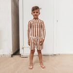 Bescherm je kind tegen de zon met dit uv zwemshirt! Gemaakt van UPF 50+ stof en voorzien van een stoere plastic rits om oncomfortabel metaal te voorkomen, biedt dit zwemshirt uitstekende bescherming en comfort. Het zwemshirt heeft verticale strepen in de kleuren beige en bruin. Leuk te combineren met de bijpassende artikelen in dezelfde print.