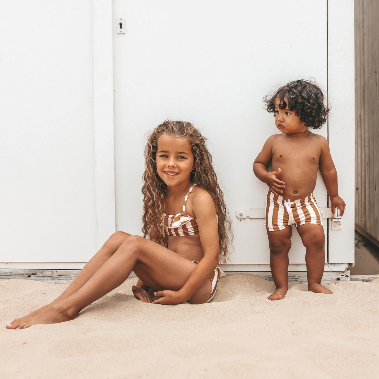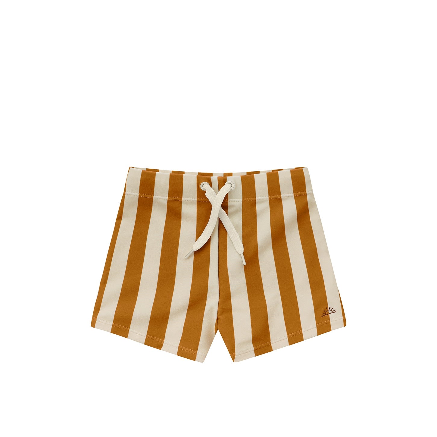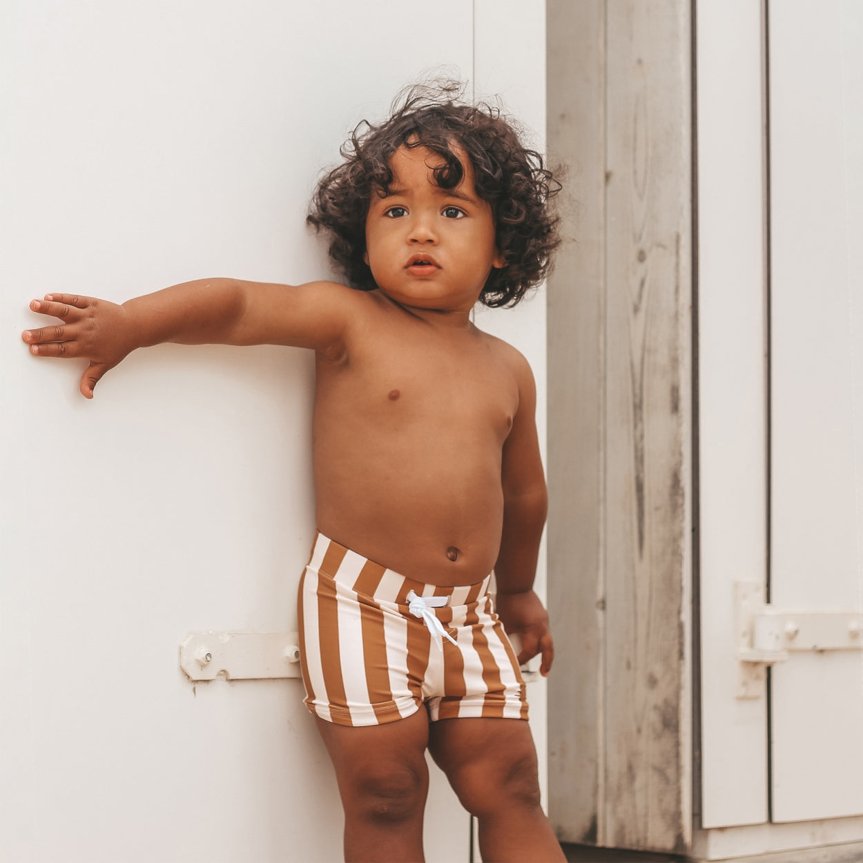 Op zoek naar een comfortabele en stijlvolle zwembroek voor je kind? Kijk niet verder dan onze Scott Swimshorts! Gemaakt van UPF 50+ stof, biedt deze shorts uitstekende bescherming tegen de zon en is perfect voor een dagje aan het strand of bij het zwembad. De zwembroek heeft verticale strepen in de kleuren beige en bruin.