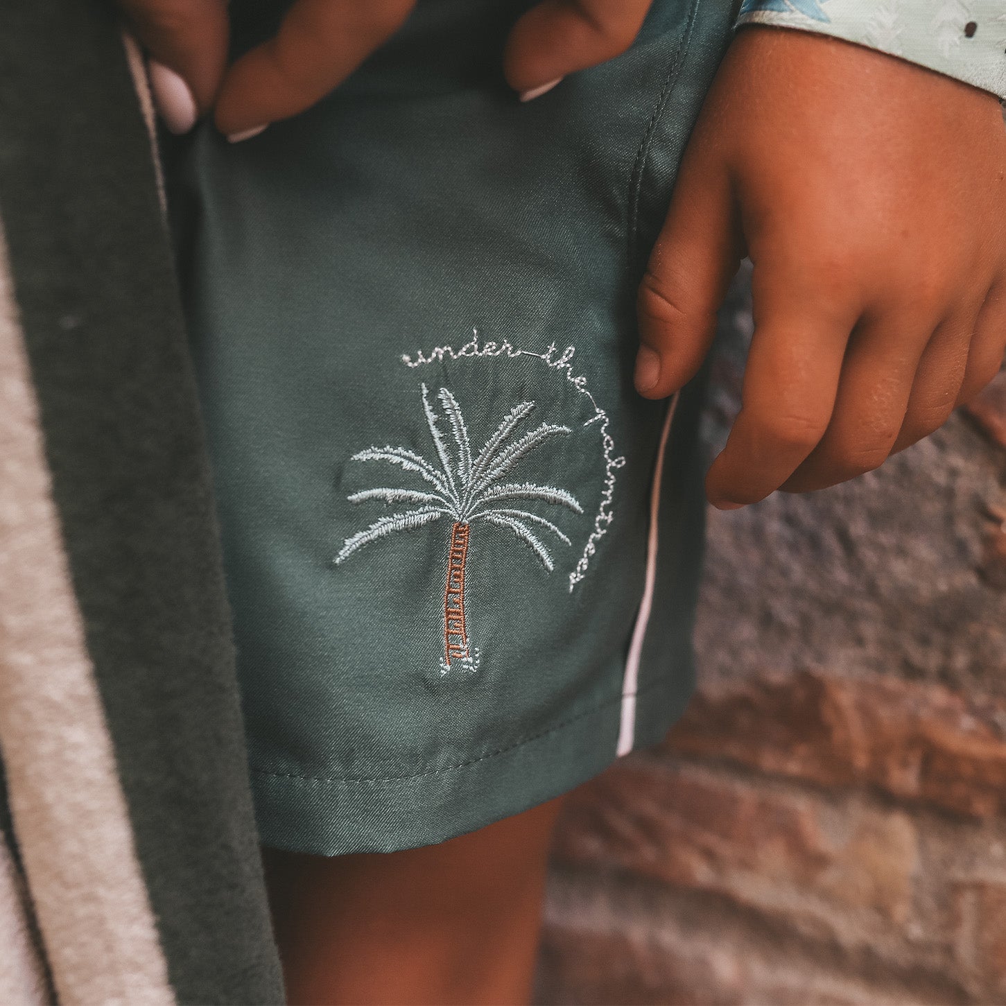 De shorts zijn verder voorzien van een stijlvolle tonal metal eyelet en een palmbomenborduursel met de tekst: 'Under the Palmtrees'. De witte piping langs de zijkanten en het Bronze Green kleuraccent maken deze zwembroek perfect voor een frisse zomerlook.