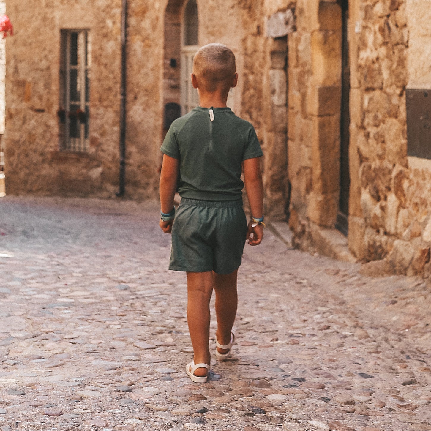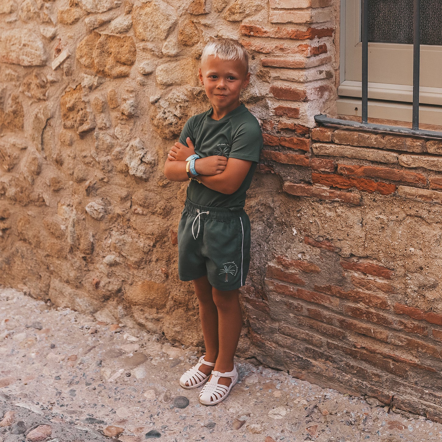 De Solid Swim Shorts in Bronze Green zijn een must-have voor dit zomerseizoen! Verkrijgbaar in maten 62/68 tot en met 134/140, zijn deze zwembroekjes gemaakt van 100% geweven polyester, wat zorgt voor een zacht gevoel en een sneldrogende pasvorm. De elastische tailleband met trekkoord zorgt voor een verstelbare pasvorm, zodat je kindje zorgeloos kan bewegen, zowel op het strand als in het zwembad. Bovendien bieden de zwembroekjes UPF50+ bescherming, waardoor je kindje optimaal beschermd is tegen schadelijke UV-stralen.