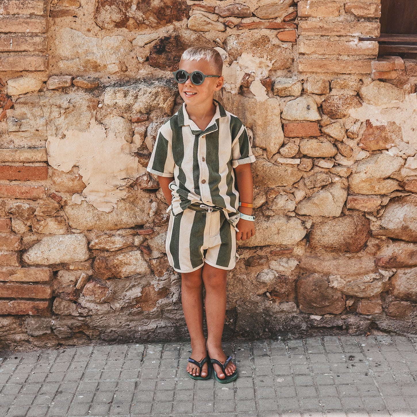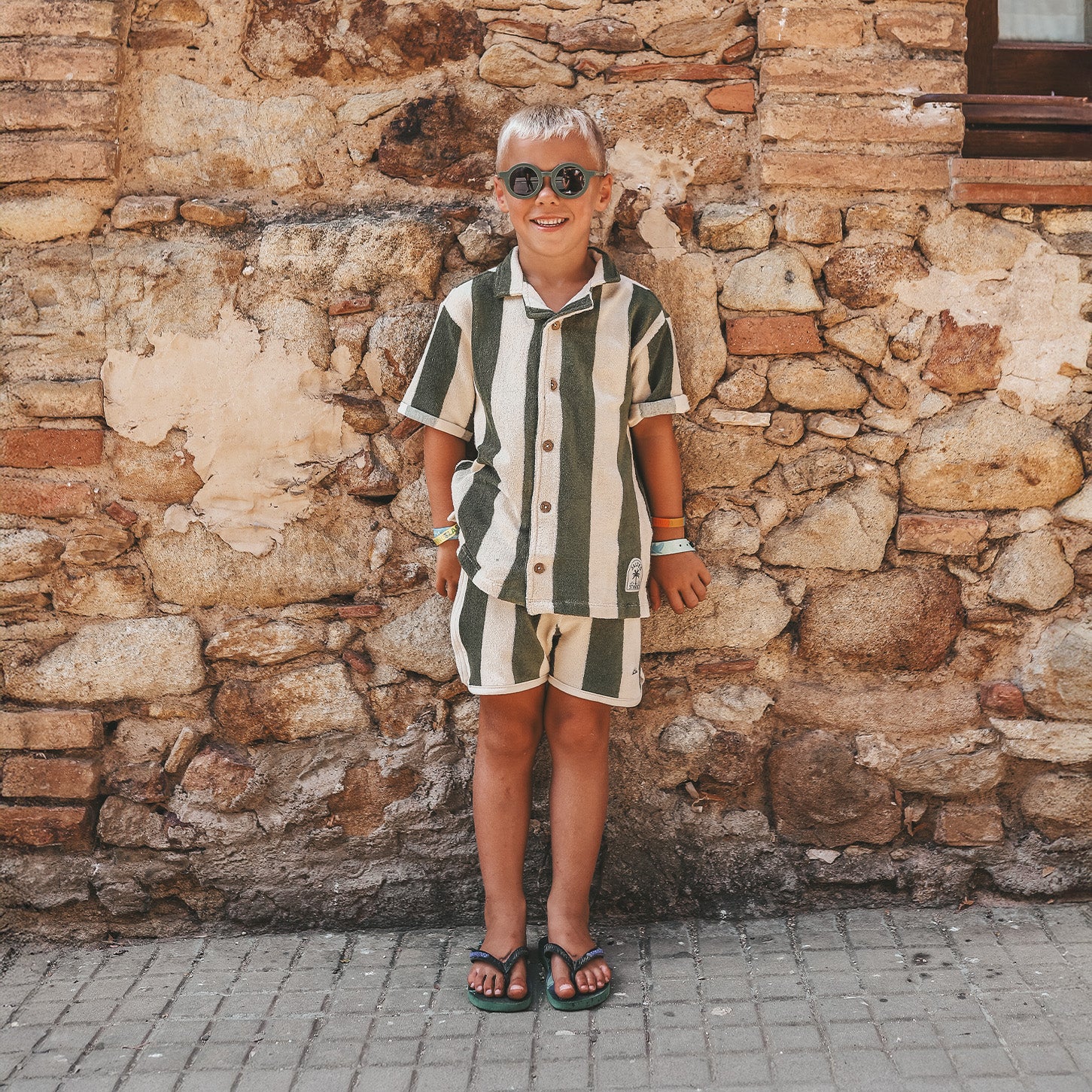 De groene Wide Stripe-print straalt vakantiegevoel uit, terwijl de kokosnootknopen en opgerolde mouwdetails zorgen voor een speelse en stijlvolle uitstraling. De subtiele split in het terry-katoen voegt een vleugje luze toe aan dit zomerse design.